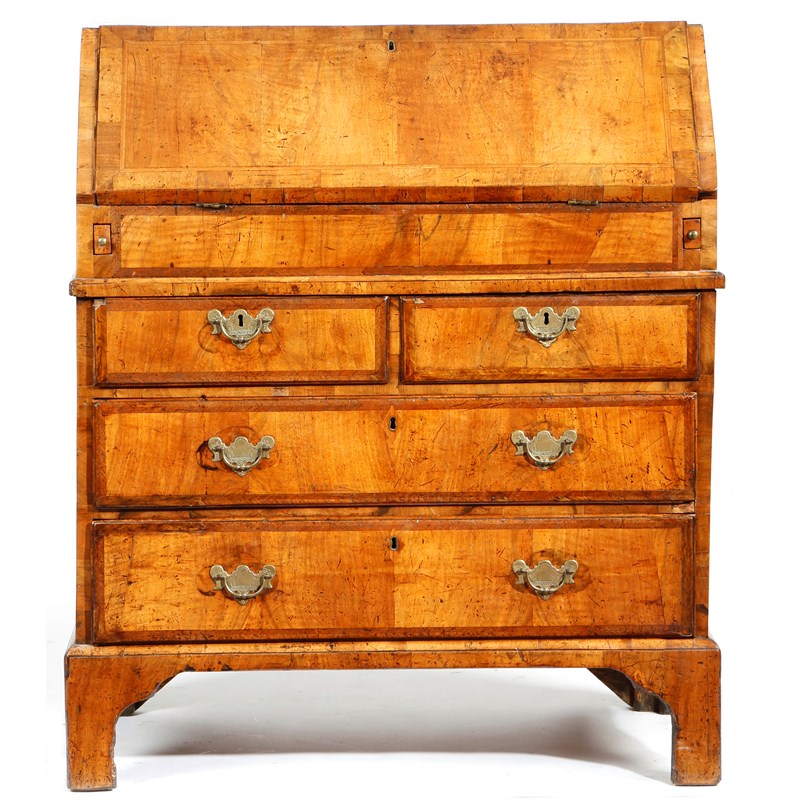 A George II walnut bureau, cross and feather banded, the hinged fall revealing an interior fitted with pigeonholes, drawers and a central cupboard, above a sliding well cover, with two short and two long drawers on bracket feet, 99.8cm high, 85.8cm wide, 49.3cm deep.