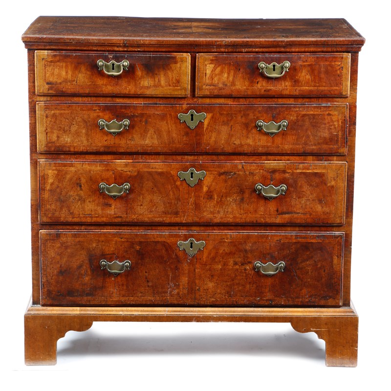 A George II walnut chest, the quarter veneered top with cross and feather banding, above two short and three long conforming drawers, on bracket feet, 92cm high, 92.8cm wide, 52.2cm deep.
