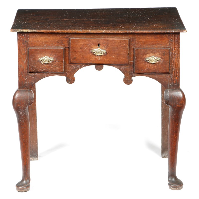 An early 18th century oak lowboy, fitted with three drawers, on cabriole front legs and pad feet, 67.5cm high, 70.3cm wide, 48.6cm deep.