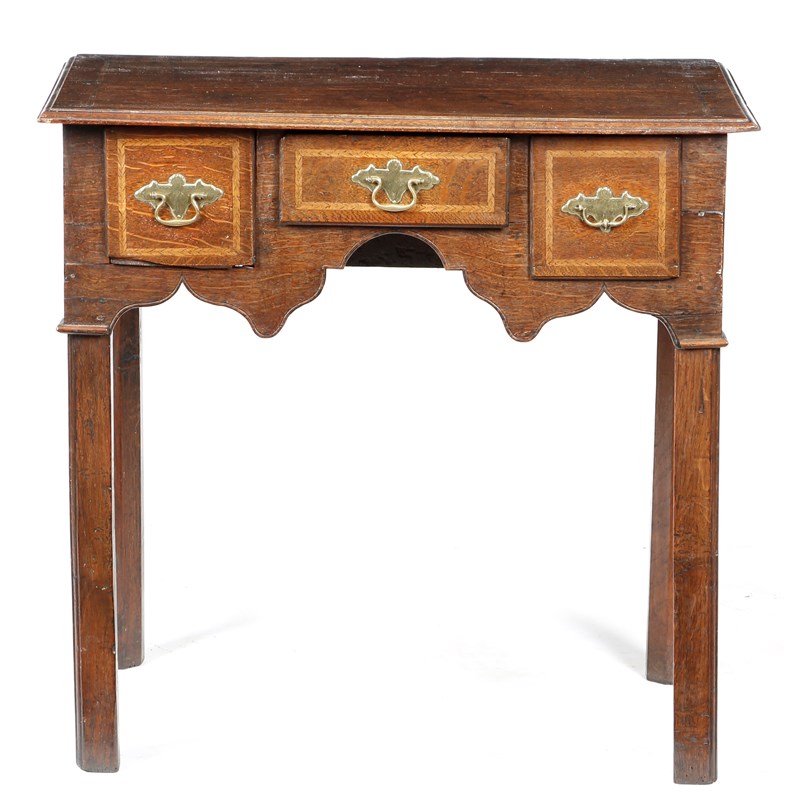 A George II oak lowboy, with ash feather banding, with three frieze drawers above a shaped apron, on moulded chamfered legs, 72.7cm high, 76cm wide, 49cm deep.