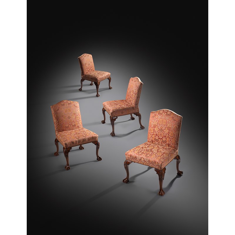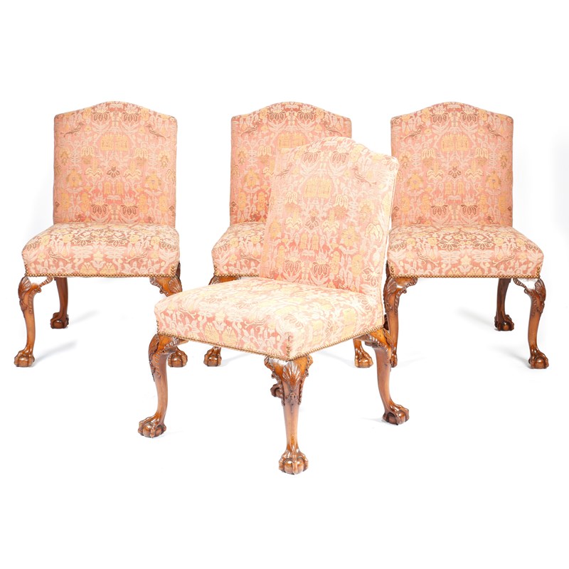 A set of four George II and later walnut side chairs in the manner of William Hallett, each with an arched padded back and seat, on four shell, husk and ribbon carved cabriole legs and claw and ball feet. (4)