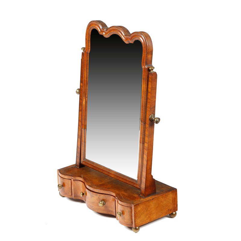 A George II walnut dressing table mirror, with a later shaped bevelled plate within a moulded frame, above a serpentine box base fitted with three drawers, on brass ball feet, 68cm high, 45cm wide, 21.3cm deep.