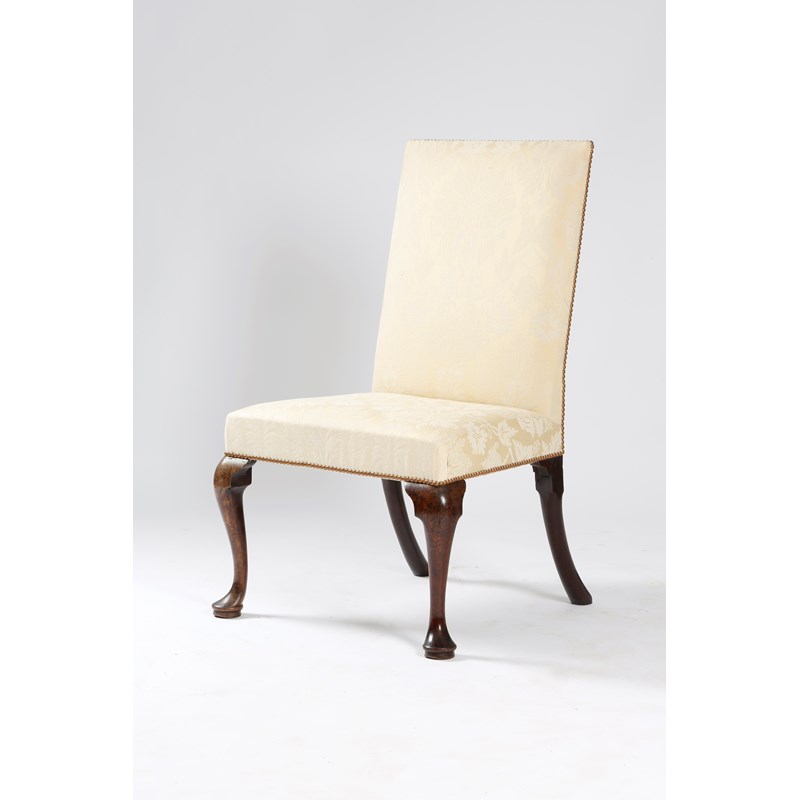 A George II red walnut side chair, the padded back and seat upholstered in damask fabric, on cabriole front legs and pad feet.