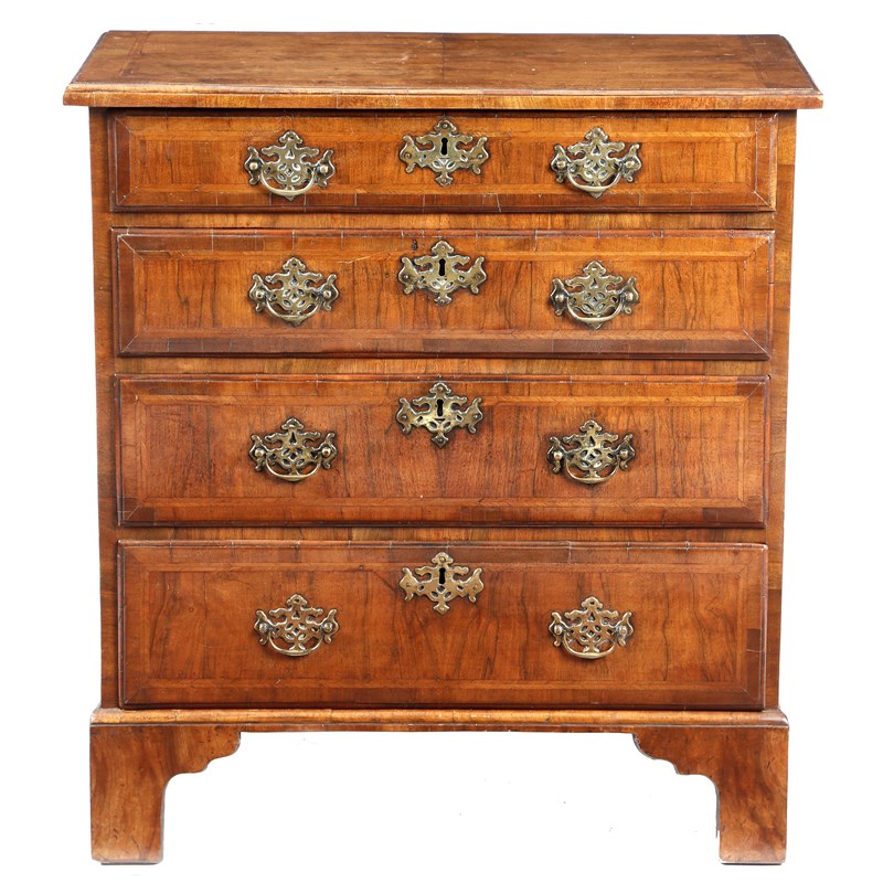 A George II walnut chest, the quarter veneered cross and feather banded top with a moulded edge, above four long graduated drawers, on bracket feet, with oak sides, 81.5cm high, 74.5cm wide, 40.1cm deep.