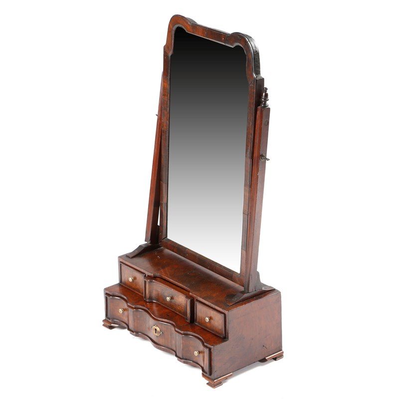 An early 18th century walnut dressing table mirror, with a later bevelled arched plate, within a moulded frame, the stepped box base fitted with four drawers with turned bone handles, 75.4cm high, 41.3cm wide, 21cm deep.
