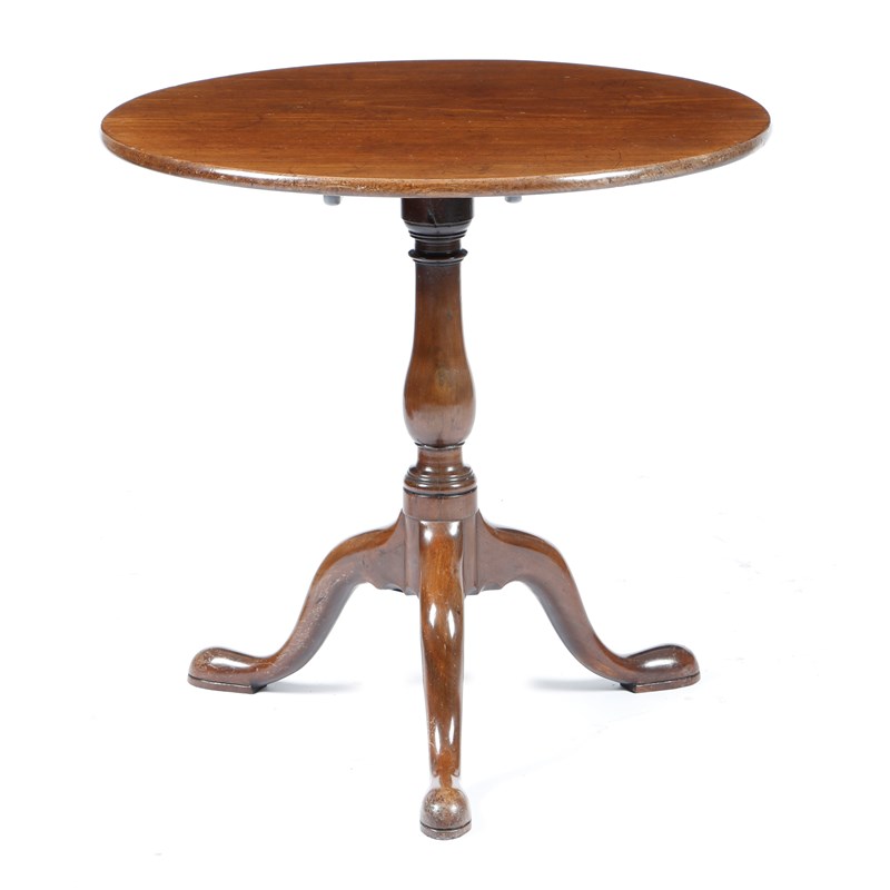 A George III mahogany tripod table, the circular tilt-top on a baluster turned stem, cabriole legs and pad feet, 71cm high, 72.8cm diameter.