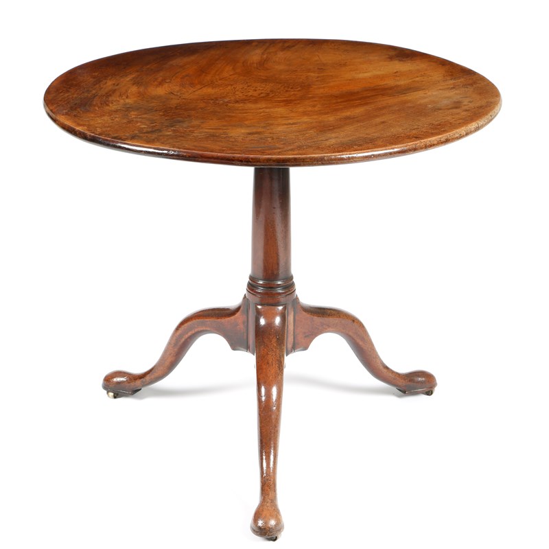 A George II mahogany tripod table, the circular tilt-top on a gun-barrel shaft, on cabriole legs and pad feet with brass roller castors, 72cm high, 84.2cm diameter.