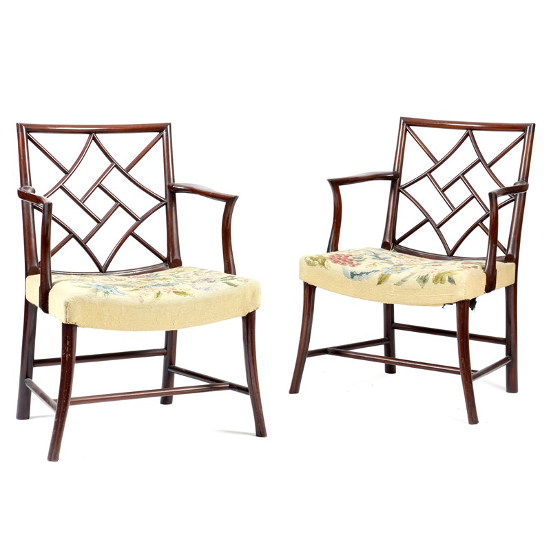 A pair of mahogany cockpen open armchairs in George III style, each with a Chinese style lattice back above a floral needlework seat, one signed to the underside 'Mrs Evershed 8, South Molton Street, London, W1', on swept cluster front legs united by an 'H' stretcher, late 19th /early 20th century. (2)