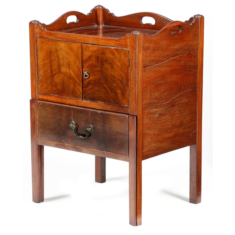 A George III mahogany tray-top bedside commode, the serpentine gallery pierced with three handgrips, above a pair of cupboard doors and a converted leather lined pull-out base, 79.8cm high, 56cm wide, 45.3cm deep.
