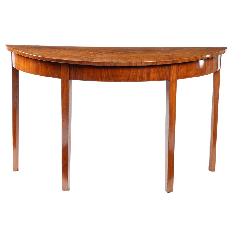 A George III mahogany 'D' shape side table, with a cross-banded top, on square tapering legs, 70.8cm high, 121.2cm wide, 47.7cm deep.