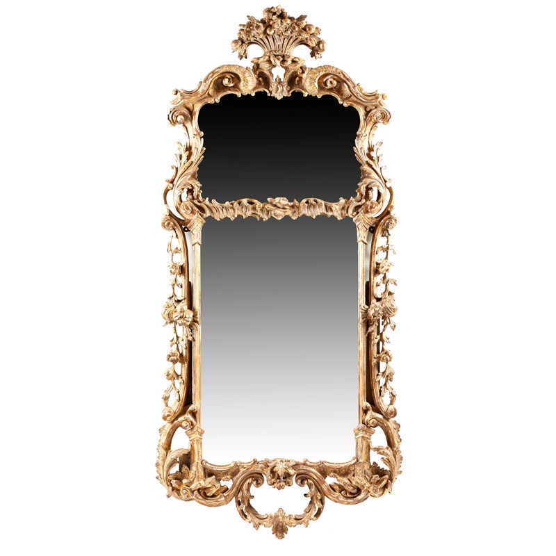 A George III giltwood wall mirror in the manner of John Linnell, with two shaped plates divided by a band of rockwork, the lower flanked by columns, within a rocaille, leaf and scroll carved frame, with a basket of flowers surmount, re-gilt, 188.4 x 89cm.