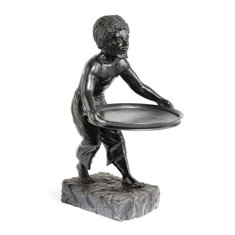 A late 19th century Italian Venetian carved and ebonised pine table waiter, in the form of a blackamoor holding a circular tray, 42.2cm high.