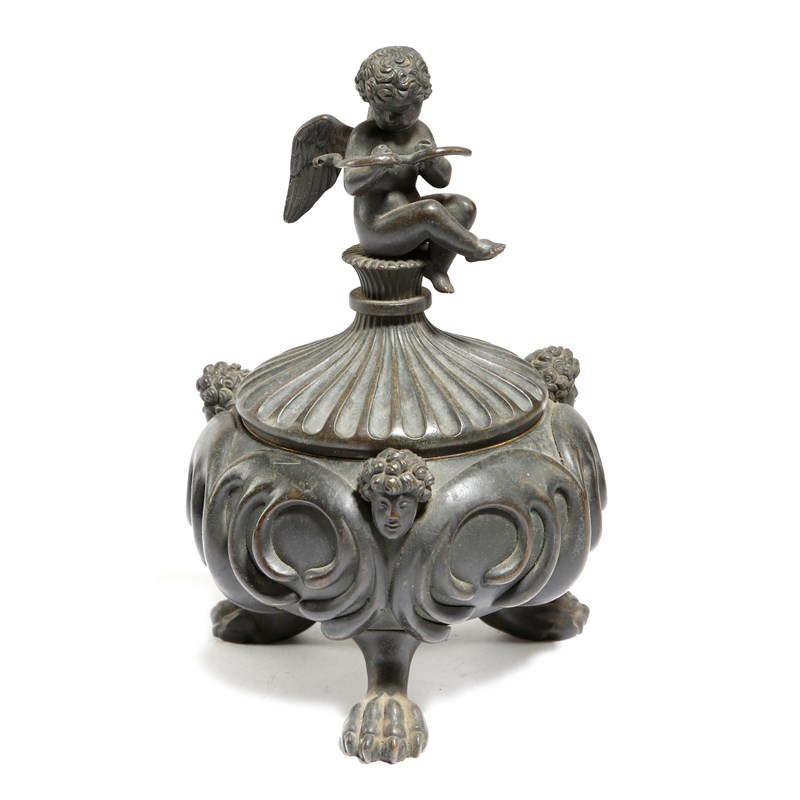 A 19th century bronze Grand Tour inkwell, the fluted lid with a Cupid finial revealing a glass liner, the scroll decorated body with male masks and on tripod lion's paw feet, 17.3cm high.