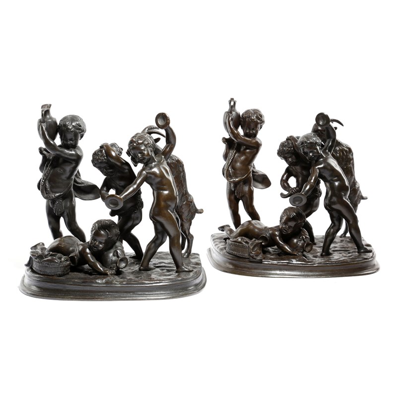 After Claude Michel called Clodion (French 1738-1814). A matched pair of 19th century Bacchanalian bronze groups, of frolicking cherubs and a ram, the naturalistic bases both signed 'Clodion', 20cm high. (2)