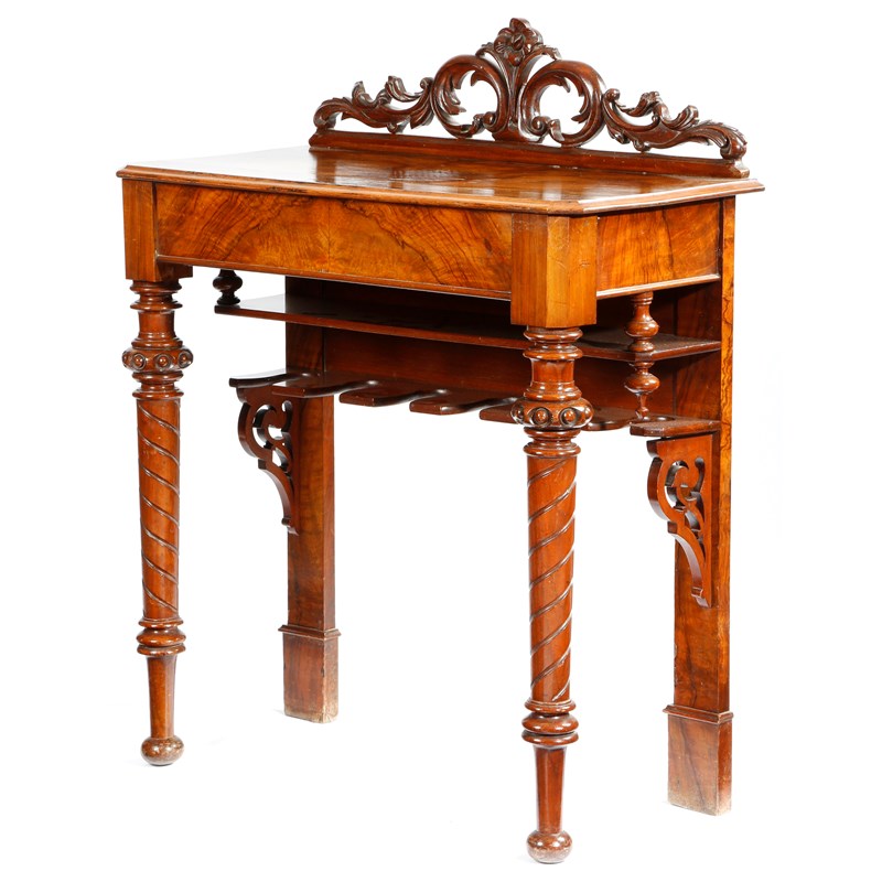 An unusual Victorian walnut whip and boot hall table, with a leaf and flower carved top rail above a shelf and with divisions for six boots, 100.8cm high, 80.8cm wide, 39.5cm deep.