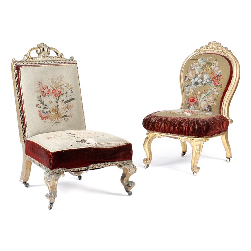 Two Victorian giltwood nursing chairs, each with a floral needlework and velvet upholstered back and seat, on castors. (2)
