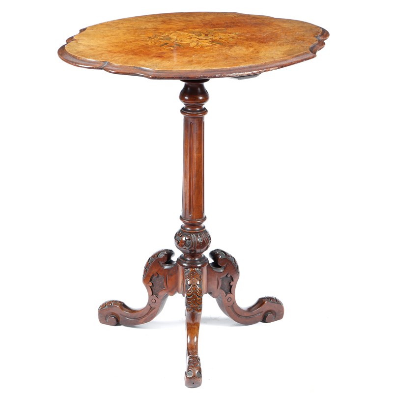 A Victorian walnut tripod table, the shaped burr veneered top marquetry inlaid with flowers and leaves, on a fluted stem and carved scroll legs, 69.3cm high, 59.5cm wide.