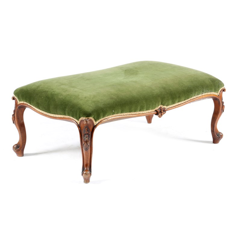 A Victorian walnut stool, the seat upholstered with green plush fabric, on leaf and flower carved cabriole legs, 40cm high, 100cm wide, 60.3cm deep.