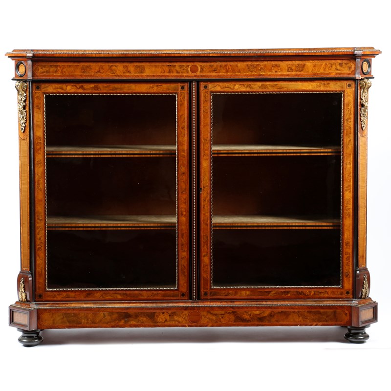 A Victorian burr walnut and ebonised display cabinet in the manner of Holland and Sons, with gilt brass mounts and inlaid with stringing, crossbanded in harewood and purpleheart, with a pair of glazed doors enclosing a velvet lined interior with two shelves, 103.7cm high, 125.5cm wide, 43.7cm deep.