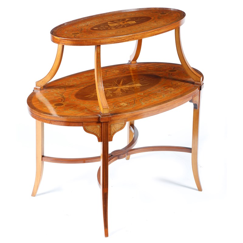 A late Victorian satinwood and marquetry oval two-tier occasional table in Sheraton revival style