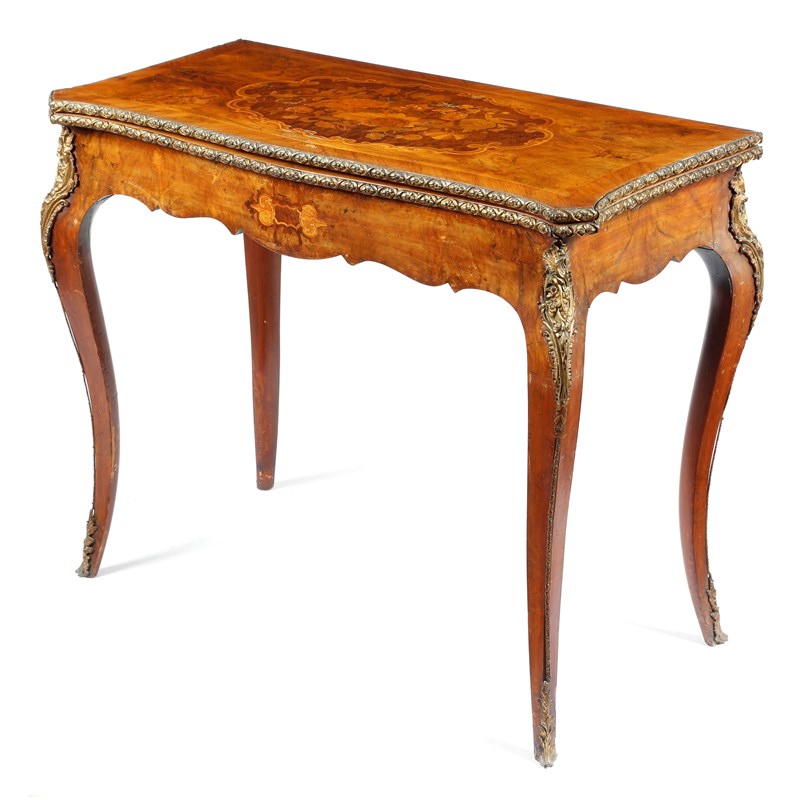 A Victorian walnut and marquetry card table in Louis XV style, with gilt bronze mounts, the hinged and swivel top with kingwood banding and inlaid with flowers, leaves and a bird, 78cm high, 92.8cm wide, 46cm deep