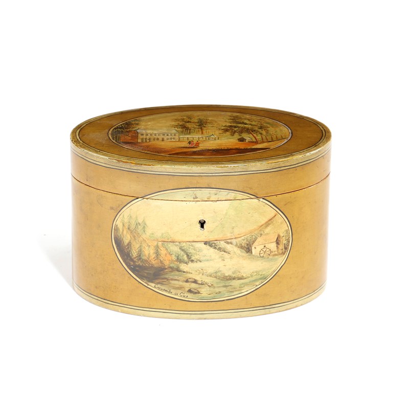 A rare early 19th century Belgian Spa oval painted tea caddy