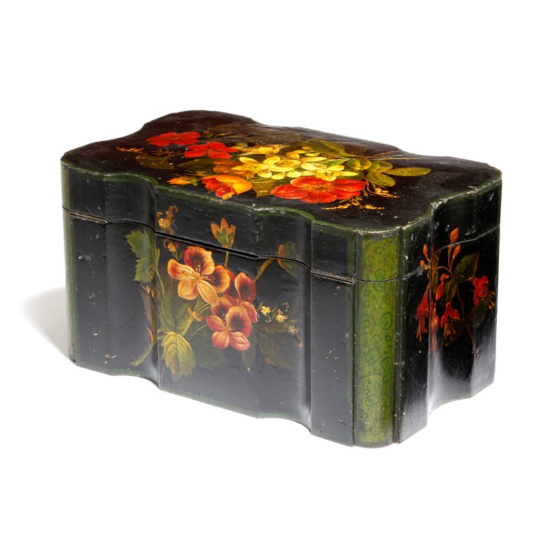 A 19th century Belgium Spa ebonised and painted tea caddy by Henri Jehin, decorated with flowers and with a conforming twin lidded interior, with bone handles, the base with a printed trade label 'a la Reine Victoria Hri. JEHIN, Peintre Fabricant A SPA', 13cm high, 24.6cm wide, 14.8cm deep.