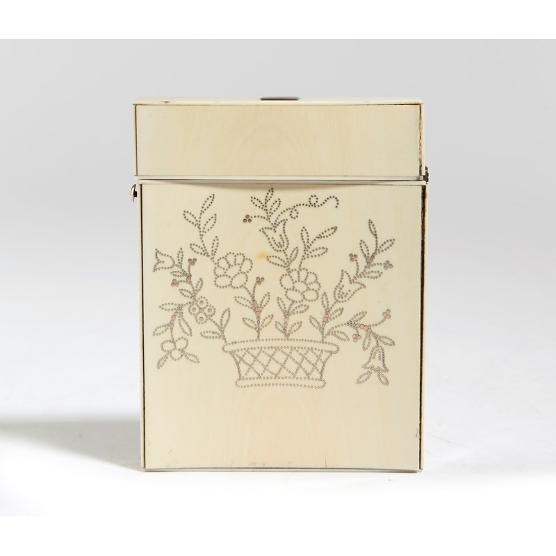 λ An early 19th century ivory and gold pique card case, decorated either side with baskets of flowers, the hinged lid with a vacant plaque, 10cm high.