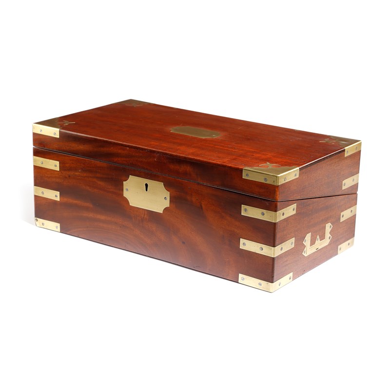 A 19th century mahogany and brass bound writing slope, the lid and front with vacant plaques, the interior with a velvet lined writing slope and pen and ink compartments, with a base drawer, 16.8cm high, 45.6cm wide, 25.1cm deep.