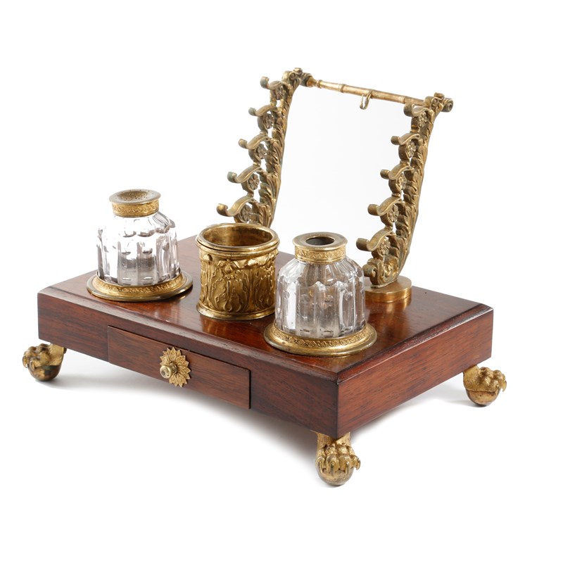 λ A 19th century rosewood and gilt brass mounted inkstand, the raised back with a watch and pen holder, above three cylindrical holders, flanked by a cut-glass inkwell and sander, with a base drawer, on lion's paw and ball feet, 18.4cm high, 25.7cm wide, 17.2cm deep.