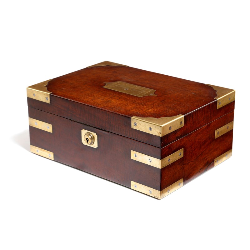 An early 19th century fiddleback mahogany and brass bound jewellery box