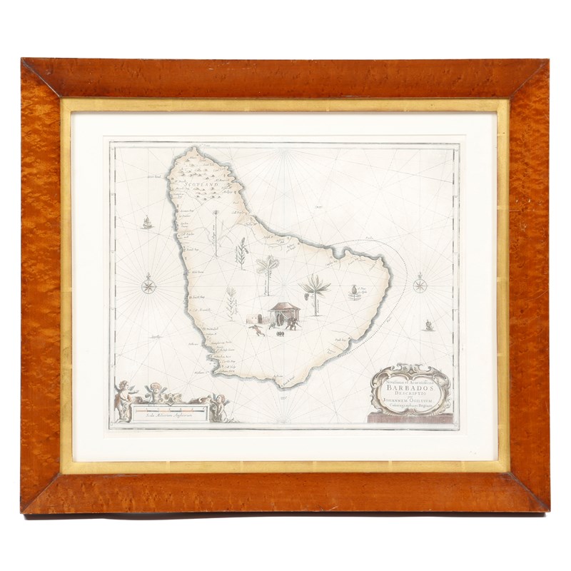 John Ogilvy (1600-1676). A hand-coloured engraved map of Barbados, with a cartouche to the lower right, inscribed 'Novissima et Acuratissima BARBADOS DESCRIPTIO per JOHANNEM OGILUIUM Cosmographum Regium', the island depicted with trees and plants, including sugar cane, a 'cabage tree', 'a pine Aple' and a 'pappaw tree', 29.2 x 35.7cm, in later glazed bird's eye maple frame.