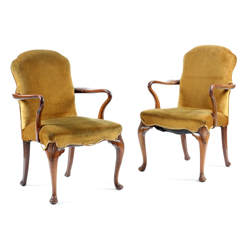 A pair of walnut elbow chairs in George II style, each with an arched padded back and seat with shepherd's crook arms, on cabriole front legs and pad feet, late 19th / early 20th century. (2)