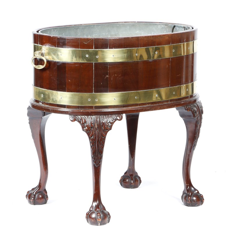 A mahogany and brass bound oval wine cooler on stand in George II style, of staved construction, with a metal lift-out liner, brass carrying handles, on leaf carved cabriole legs and claw and ball feet, the underside stamped '3876', late 19th / early 20th century, 67.3cm high, 70cm wide, 47cm deep.
