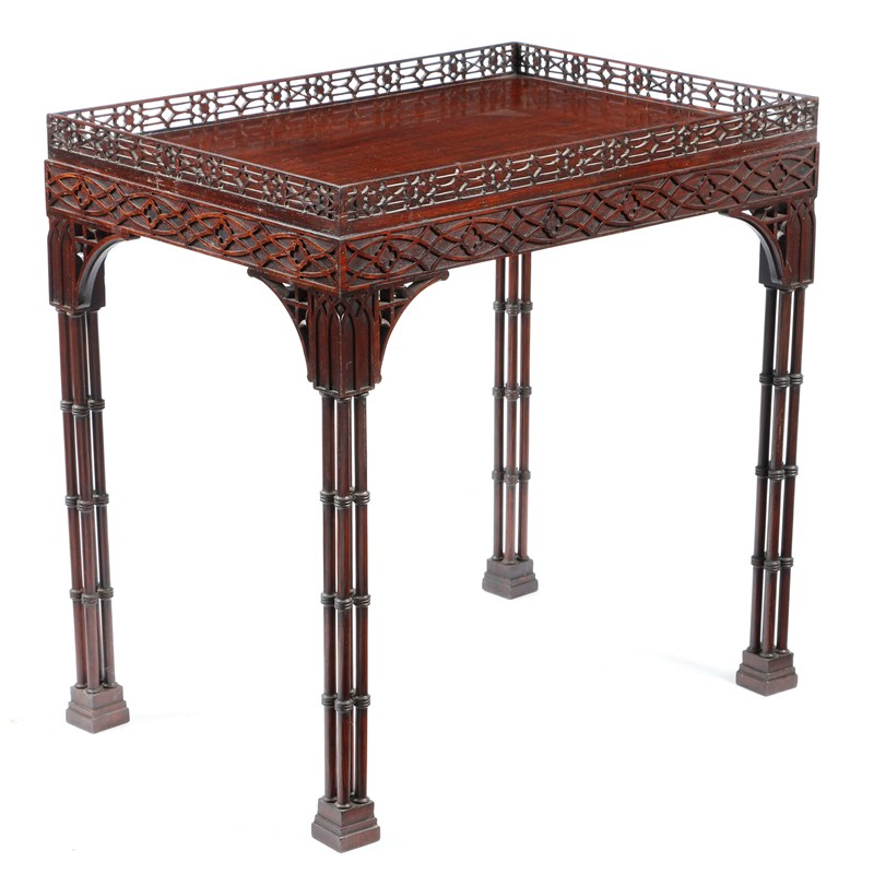 A hardwood silver table in 18th century Chinese Chippendale style, with a pierced gallery above a blind fret frieze on cluster column legs and block feet, 74.8cm high, 74.5cm wide, 52.5cm deep.