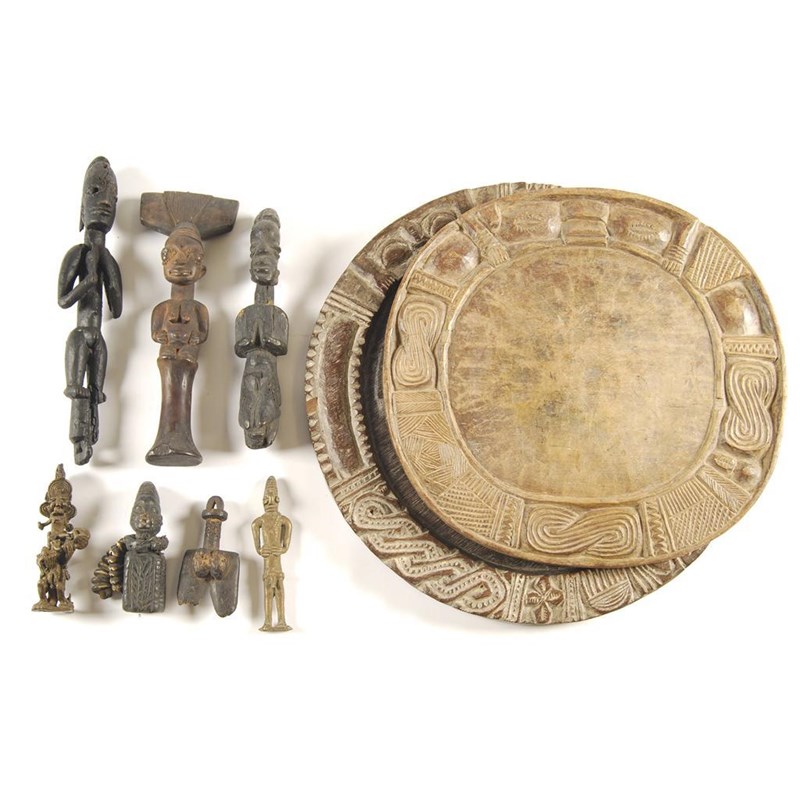 Two carved hardwood platters, with raised borders decorated faces and hands (Eshu), the largest 18in (45.5cm) dia, Yoruba, together with five wood carvings and two brass cast figures. (9)