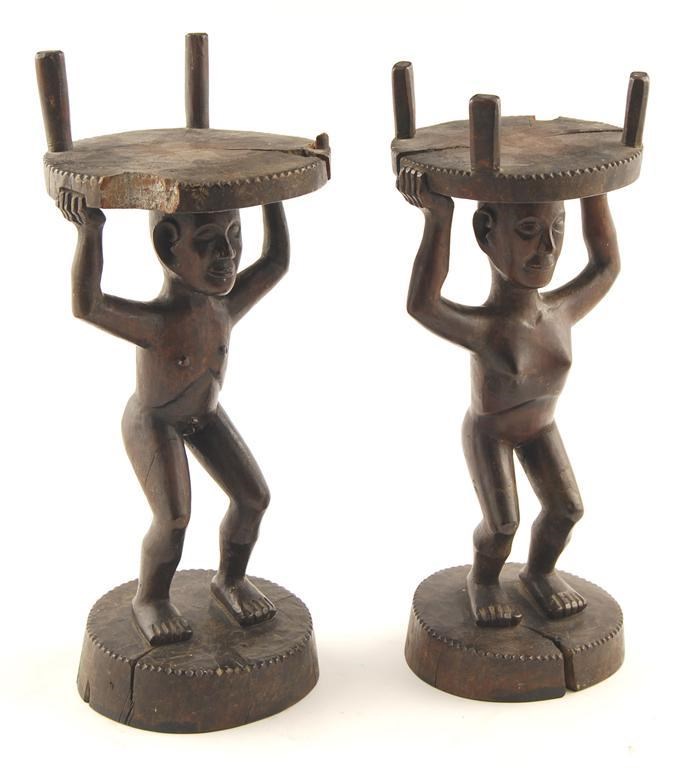 A pair of Ingovat Phillipine carved wood figures, of a male and a female, each supporting a circular disc with further supports (three missing), 13.5in (34cm) h. (2)