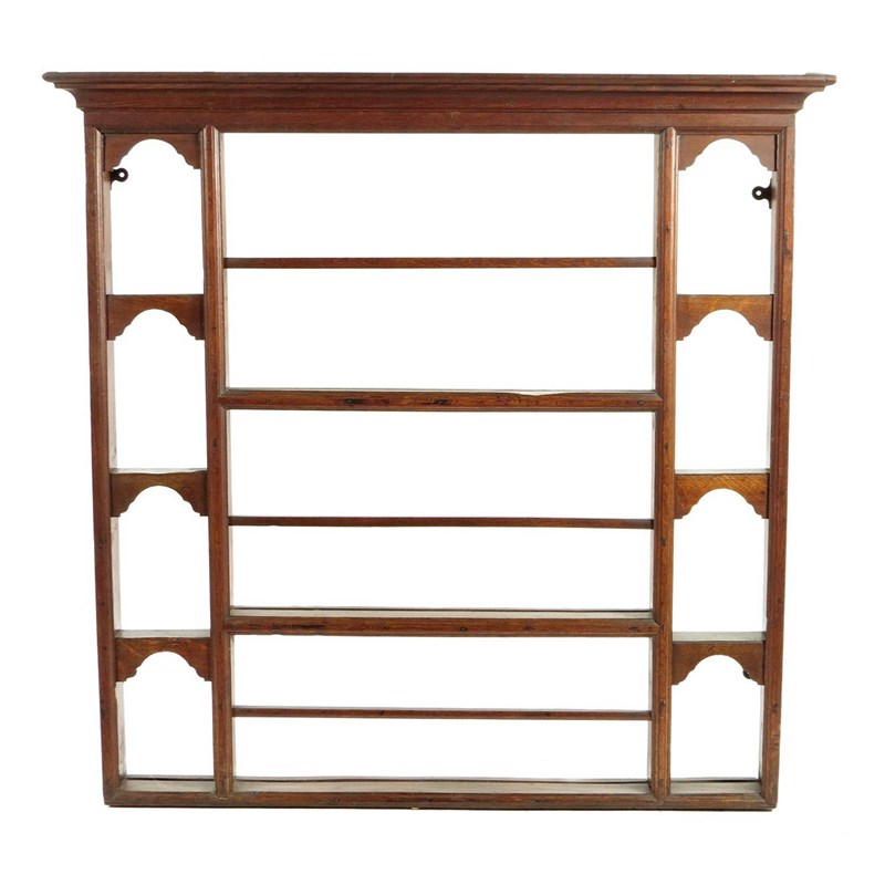 An oak and pine plate rack, with three central shelves flanked by four arched alcoves to either side, late 18th / early 19th century, 120.1cm high, 122.7cm wide, 15.8cm deep.