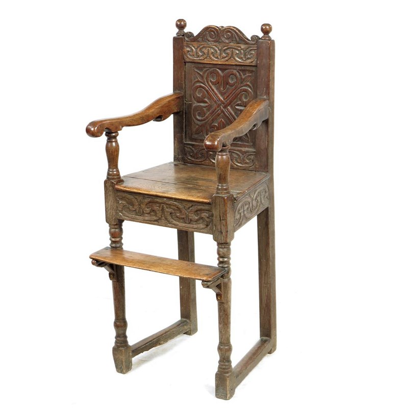 A joined oak child's high chair, with a carved panel back.