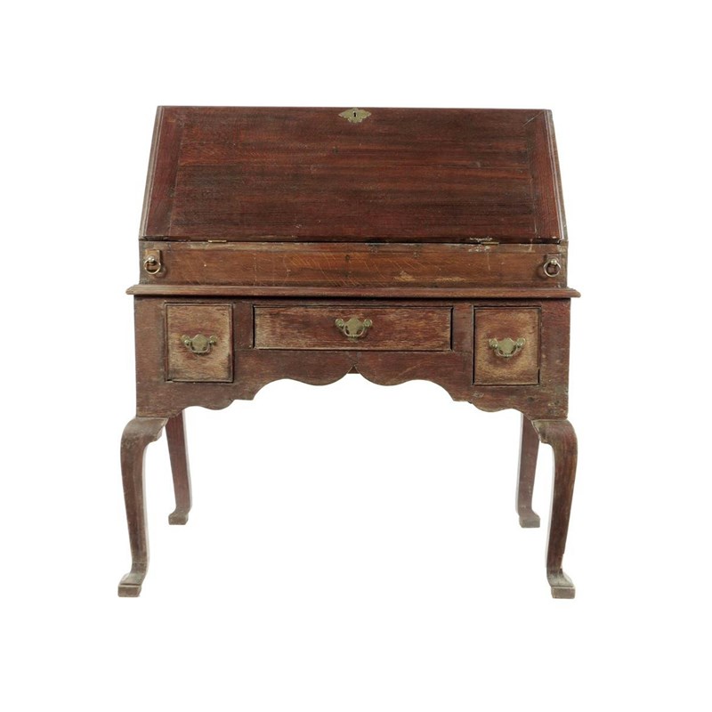 An oak bureau on stand, the fitted interior with pigeon holes, drawers and a well with a sliding cover, the stand with three drawers on square section cabriole legs, mid 18th century and later, 108cm high, 99.4cm wide, 55.4cm deep.