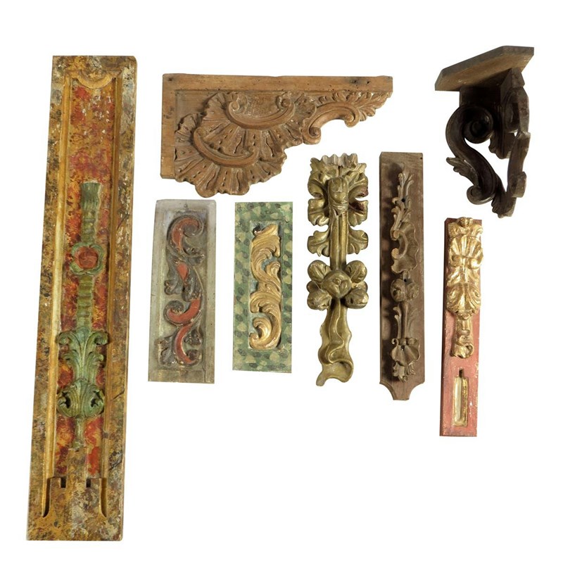A small collection of Spanish plaques and carvings, including: polychrome decorated panels, a chestnut corner bracket and a giltwood corbel, 17th / 18th century, 98.5cm high, max. (8)