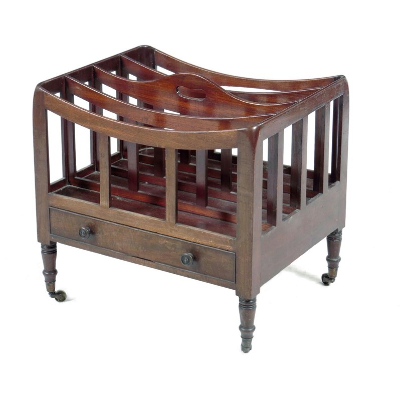 A Regency mahogany Canterbury, with four dipped divisions and a central pierced handgrip above a frieze drawer on brass castors, 50.3cm high, 50.5cm wide, 40cm deep.