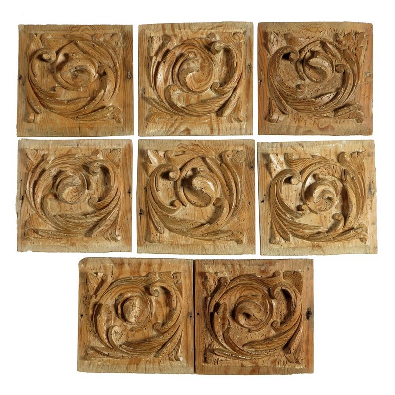 A set of eight Spanish carved pine panels, decorated with leaf scrolls, 17th / 18th century, 22 x 22.3cm. (8)
