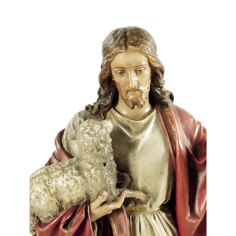 A 19th century continental carved and painted pine model of Christ the Shepherd