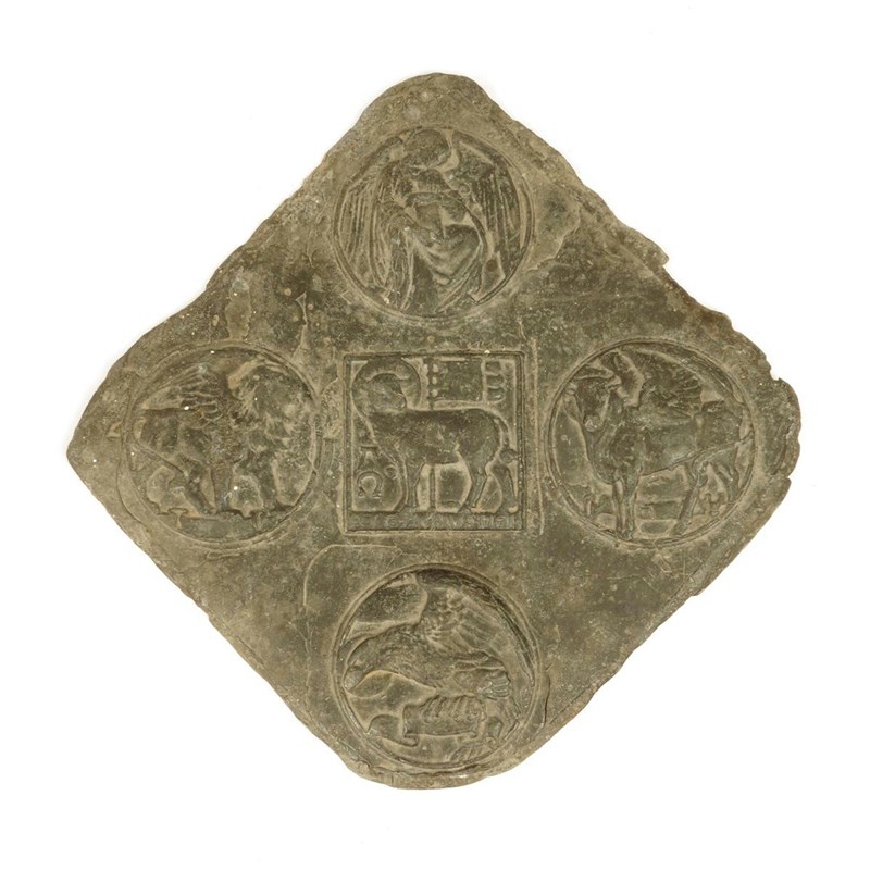 An 18th century lead plaque, relief decorated the symbols of the four evangelists, the centre with the Agnus Dei, 21.3cm square.