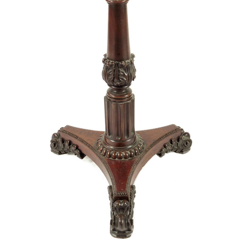 A pair of George IV mahogany pole fire-screens in the manner of Gillows, each with a brass pole with a bud finial to an adjustable carved giltwood frame with embroidered silk and wool panels, one of the Rooke coat of arms, with the motto' 'NOS PASCIT DEUS', on a fluted and nulled triform base and leaf carved scroll feet, 144.4cm high, 44.5cm wide. (2)