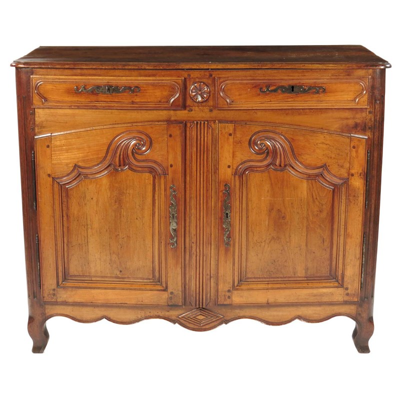 A late 18th century French provincial cherry and oak buffet, with a pair of panelled drawers above conforming cupboards enclosing a later shelf, 108.8cm high, 133cm wide, 62.4cm deep.