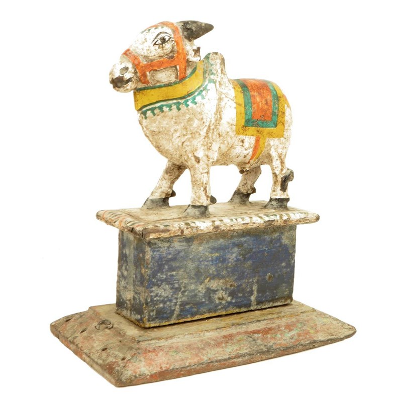 A carved wood and polychrome decorated model of a brahman cow, with a brightly painted bridle and saddle, raised on a plinth, possibly Indian or South American, 27.6cm high, 24.3cm wide, 14.3cm deep.