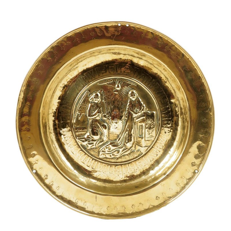 A 16th century German brass alms dish, the centre decorated with the Annunciation of the Virgin, within a band of script, Nuremburg, 37cm diameter.