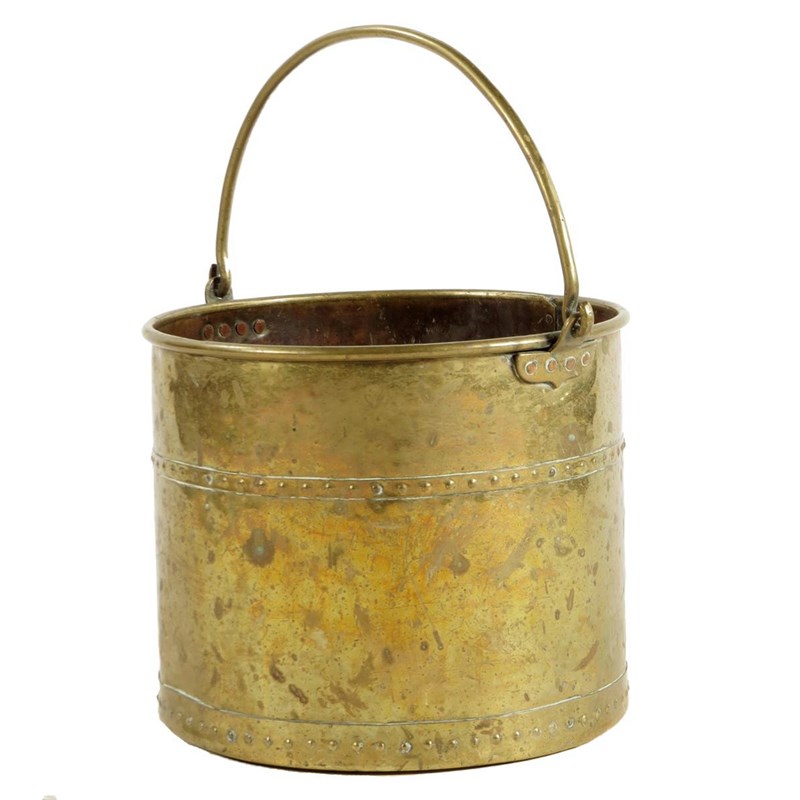 A Dutch brass log bin, the swing handle to a riveted body, 19th century, 32.cm high, 41.5cm wide.